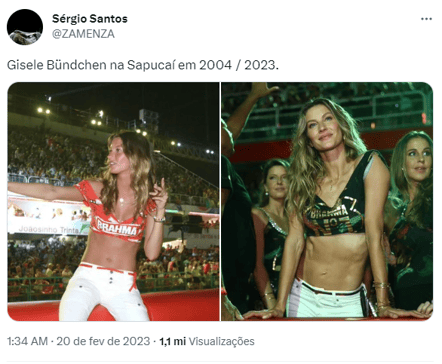 Aos 42 anos, a übermodelo teve penteado e maquiagem assinados pelo badalado beauty artist Henrique Martins e estava trajando um look idêntico ao que usou no Carnaval de 2004. A ideia foi cuidadosamente concebida pelo stylist Pedro Sales, responsável também pelo visual de carnaval de Sabrina Sato, Ivete Sangalo, Bruna Marquezine e Marina Ruy Barbosa. O resultado foi a comparação da Gisele dos anos 2000 com a Gisele de hoje, mostrando que o tempo tem sido seu amigo, e ela se mantém bela, potente e mais “sarada” do que nunca.