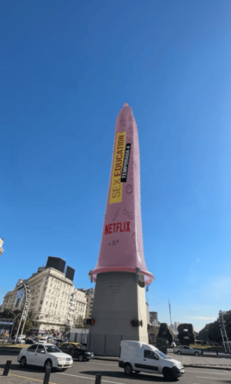 Feita pela empresa de efeitos especiais Vertex CGI, a pedido da Netflix, a campanha para divulgar a última temporada de Sex Education cobriu virtualmente o Obelisco de Buenos Aires com uma camisinha cor-de-rosa